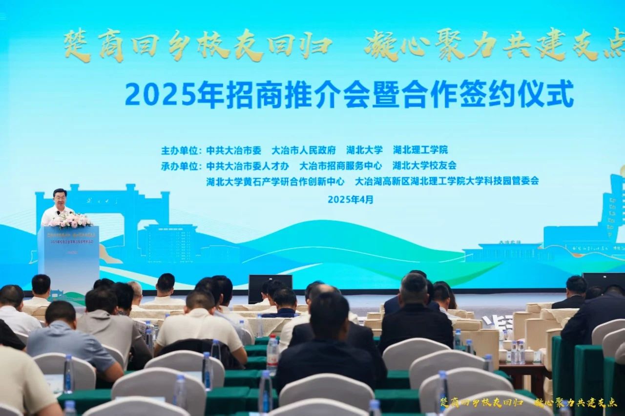 大冶市委副书记、市长潘小进作产业投资推介;湖北大学黄石产学研合作创新中心主任李海波作科技成果推介;湖北大学与大冶市人民政府签订了全面深化战略合作协议;21个校企、校地、校友投资合作项目现场签约。